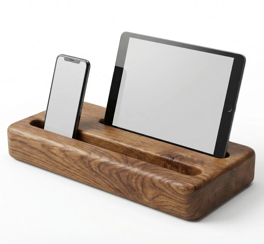 A wide oak base with two parallel slots – one for your phone, one for your tablet. Both devices should be accessible without taking up extra sleeping space. The dual-device stand is our community’s most requested design.
